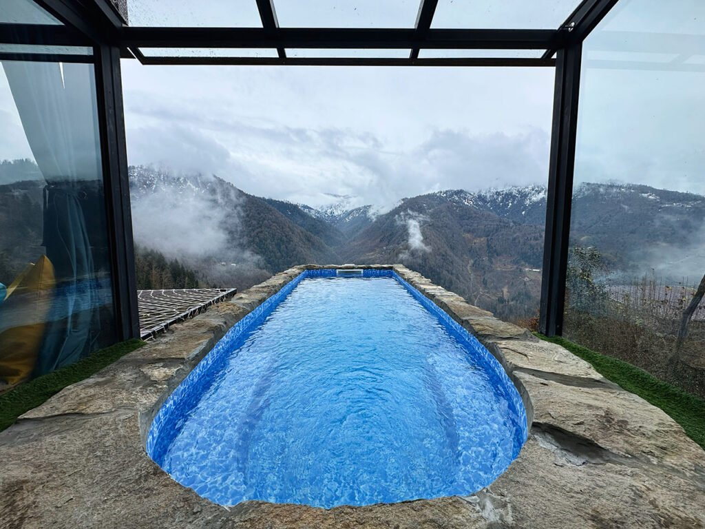 ორი სართული, ორი საძინებელი. ფართობი: 50 კვ.მ + 2 ვერანდა 12 კვ.მ.  მაქსიმუმ 6 ადამიანი.   კოტეჯში: შუშის საძინებელი მეორე სართულზე საძინებელი პანორამული ფანჯრებით პირველ სართულზე გარე საცურაო აუზი 2 კონდიციონერი 2 აბაზანა ჰამაკი ჩაიდანი უფასო WiFi ვერანდა მეორე სართულზე უნიკალური დივანი-ჭაღი შეამოწმეთ ფასები და დაჯავშნეთ  12 წლამდე ბავშვები არ დაიშვებიან.სასტუმროში არ დაიშვება შინაური ცხოველები.კოტეჯის